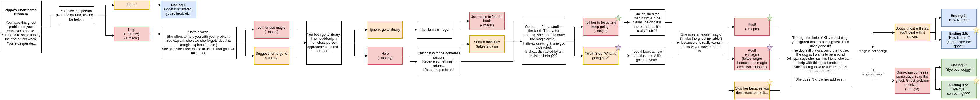 With that, I designed the story surrounding that mechanic. The plot is very light, nothing deep at all. After all, characters interaction and banters are what I have the most fun working on. The biggest struggle I had was with the branching endings. I felt like it's important to have the magic level+food mechanic having a big impact to different endings, so I made two endings; for a what-if situation of her succeeding to solve her problem vs. failing to do so.