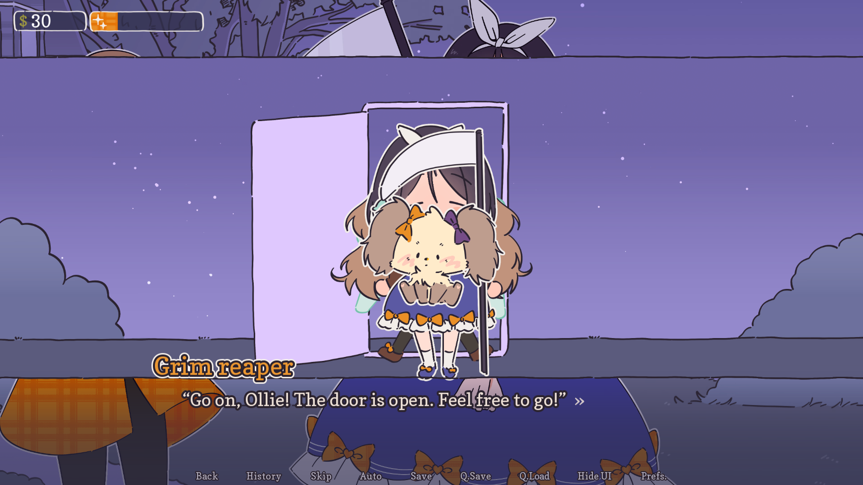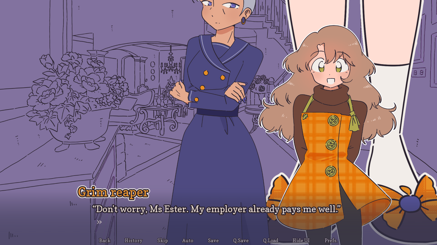 - Some scenes were really fun to make overall! Postal bird, Miss Ester and Grim-chan are my favourites! These happen to be the ones with some visual directions, and I had to compromise a lot between my visions vs what I can realistically code within the jam period. The direction was very simple for now, but the experience of going through outline -> ideas -> script -> art -> putting all together was really inspiring. I hope to do better next time!