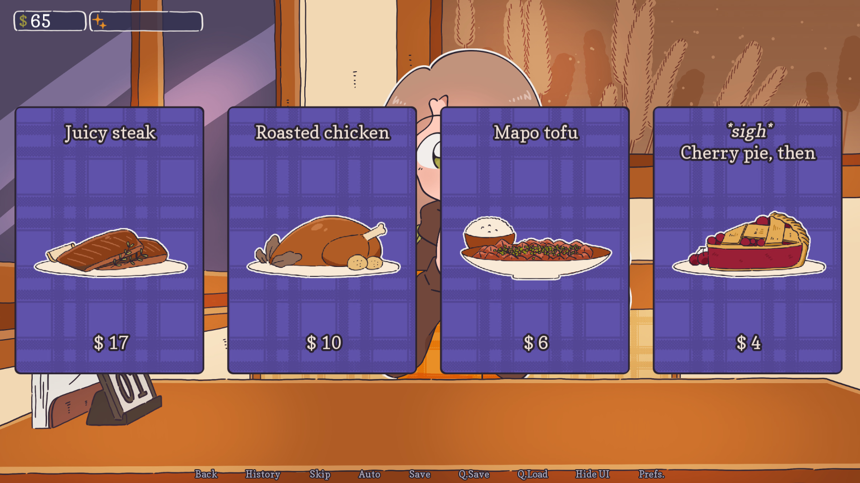 - Last-minute script change: food's value tweaking and how the dialogue follows up, it was a plot-hole-like flaw which made the multiple ending 'game' felt wrong for me. In short: in the original script I 'forced' certain ending to happen regardless of the choices picked, and that would make the choices meaningless. I was able to adjust this and made the choices more meaningful.